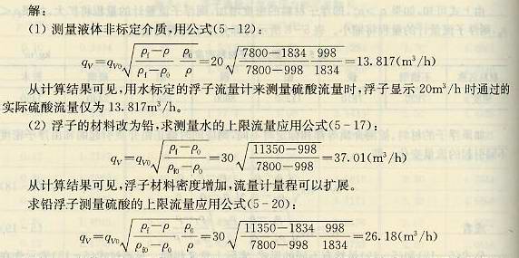 例一:一浮子流量計,浮子材料為鋼,密度為ρ=7800kg/m3,用20℃的水標定(水的密度為ρ=998kg/m3,流量計測量上限為30m3/h.現(xiàn)用戶用來測量流速(硫酸密度為ρ=1834kg/m3),求: